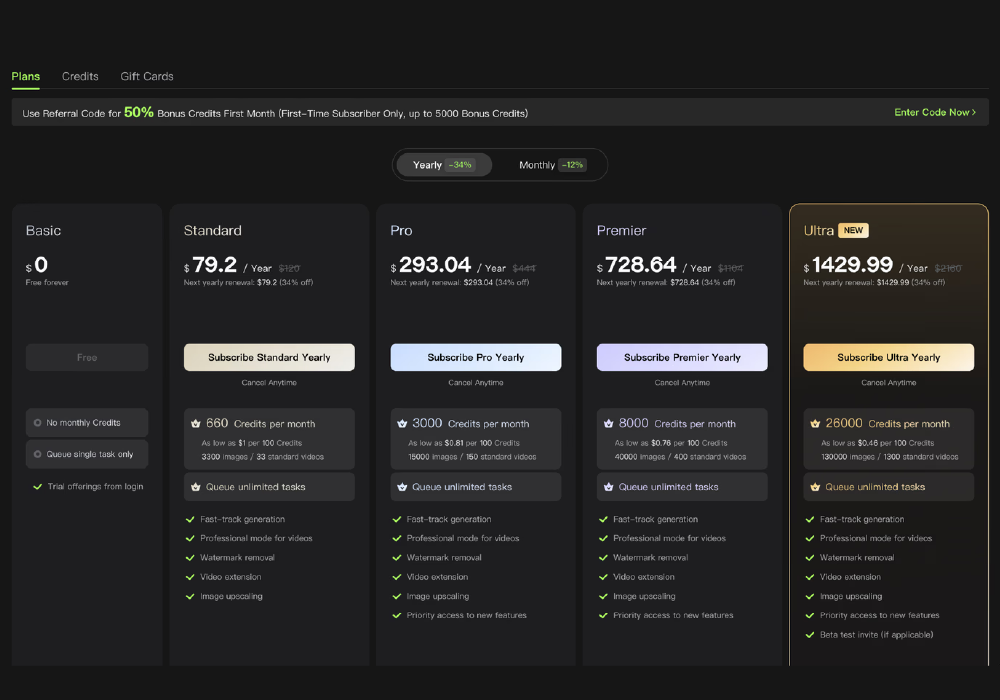 The standard plan is designed for casual creators. It offers a monthly allocation of credits, watermark-free exports, and improved generation speed. This plan is suitable for social media creators, small businesses, and users with light but consistent content needs.
