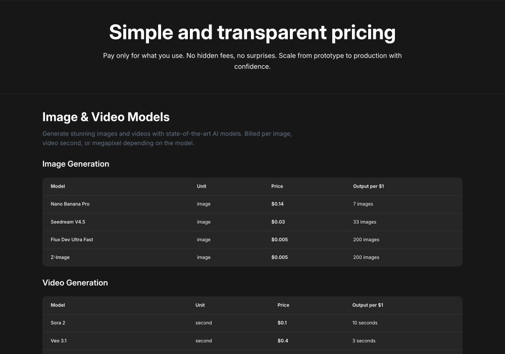 • Pay-as-You-Go Credits: Purchase credits to generate images, videos, or audio at your own pace