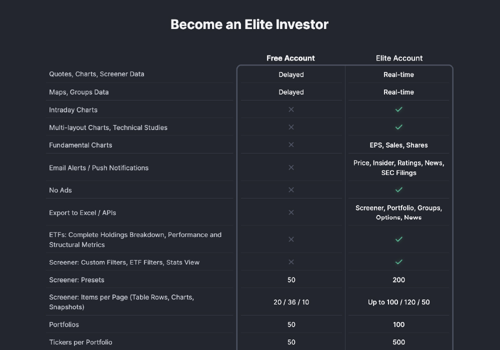 Finviz follows a freemium model, making it accessible to a wide audience. The free version includes essential tools such as the stock screener, delayed market data, basic charts, and heatmaps. For many users, these features are sufficient for regular research and analysis.