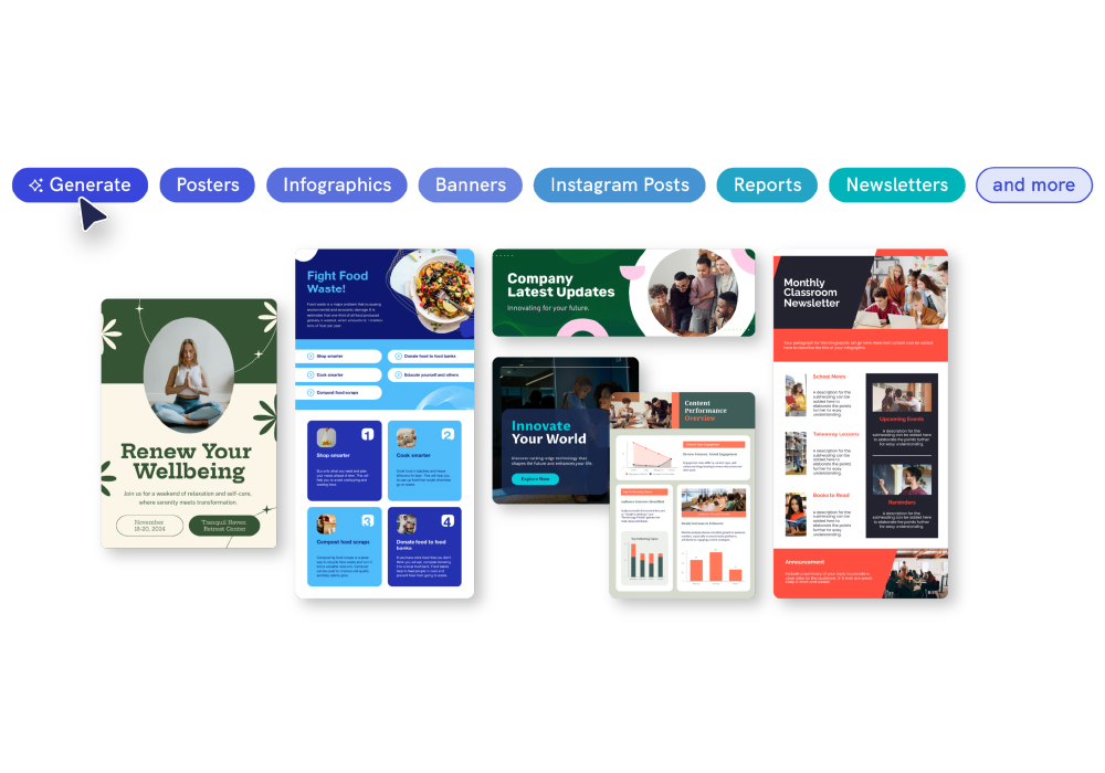 - Customizable Templates – Professionally designed templates for infographics, presentations, reports, posters, and social visuals.