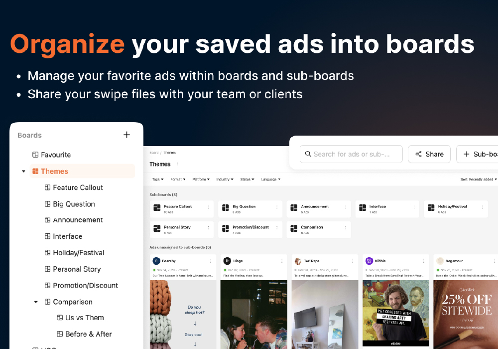 - Organize creatives with boards and comments