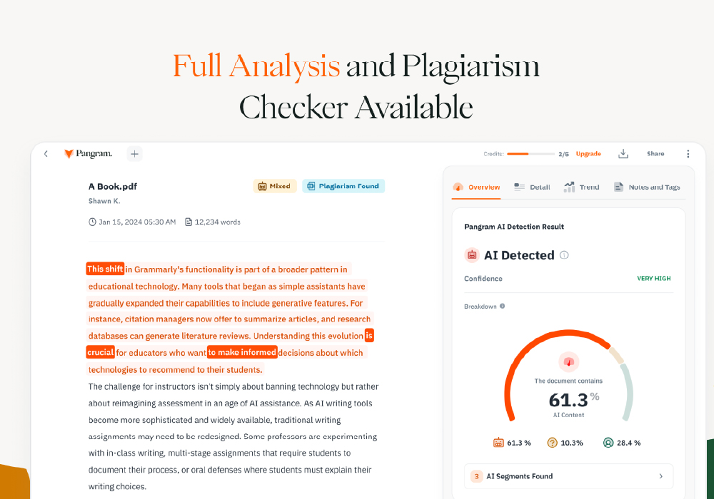 Pangram eliminates these inefficiencies by combining AI detection, plagiarism scanning, and detailed reporting in a single, easy-to-use platform.