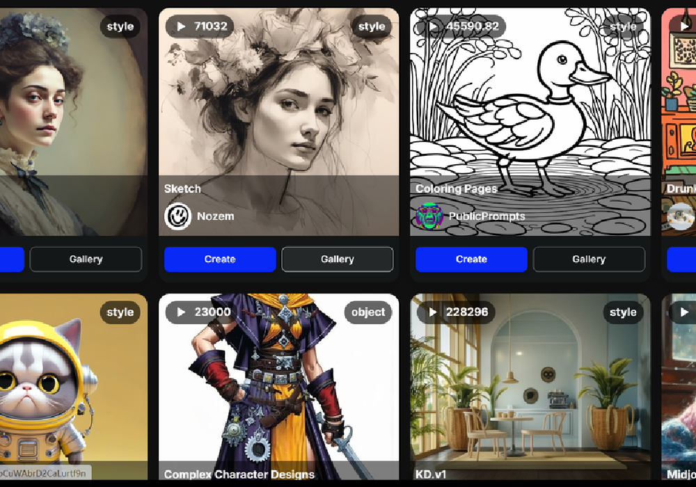 The platform includes a community-driven environment where users can explore shared prompts, remix creations, and learn from other artists’ workflows.