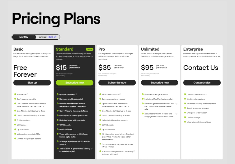 - Standard/Pro Plans: Provide more credits, higher-resolution outputs, advanced models, custom effects, and cloud storage.