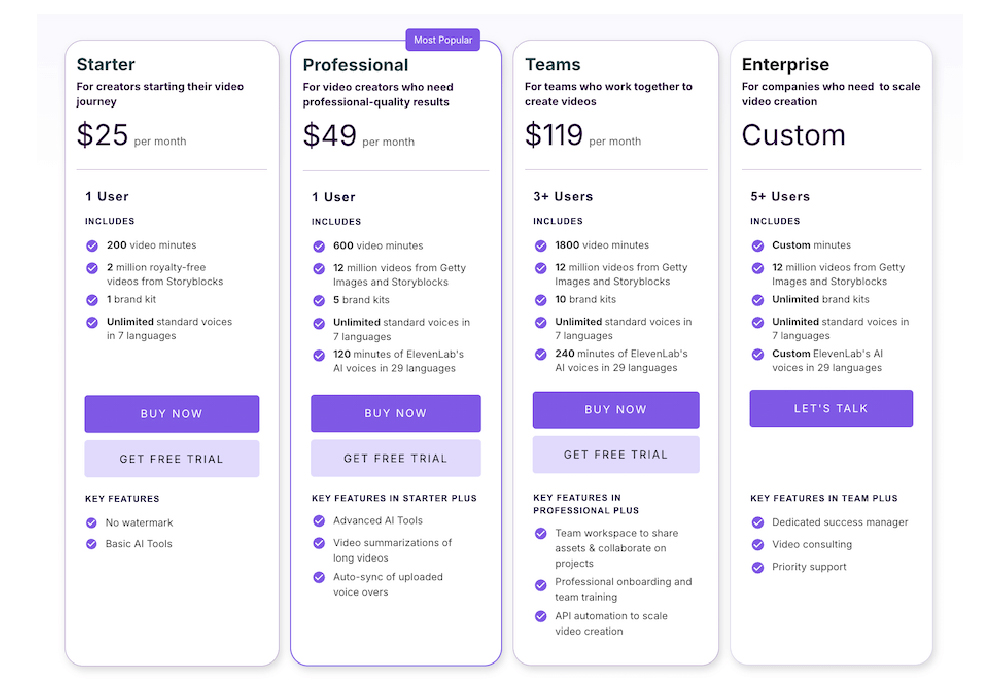 Designed for beginners and occasional creators, this plan offers essential video generation tools, basic export options, and limited monthly usage. It enables users to explore the platform and experiment with automated video creation.